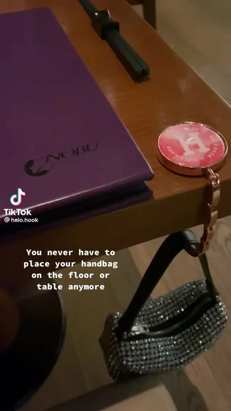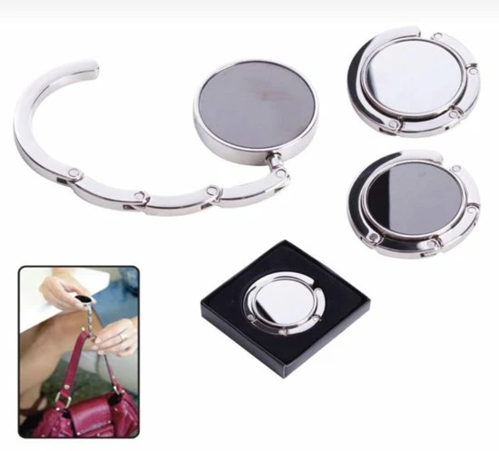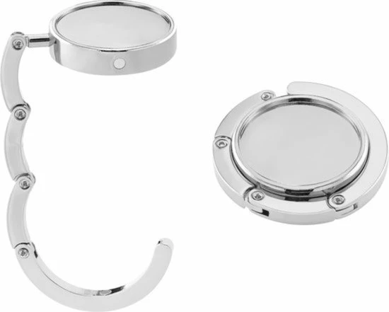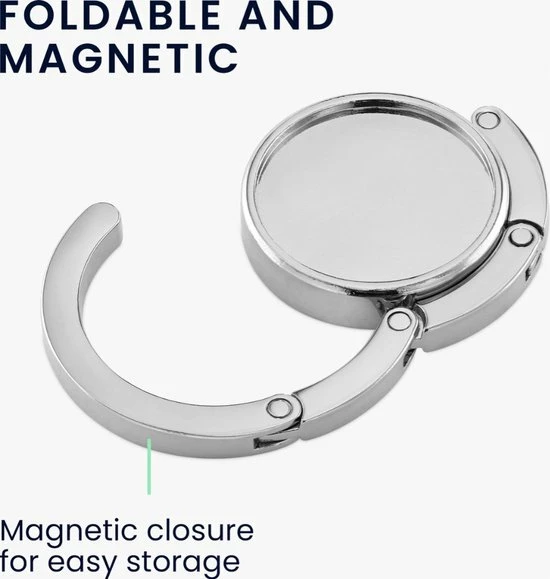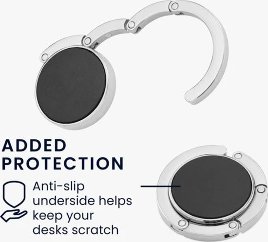 Tassenhaak uitvouwen, bevestig de magnetische plattekant aan tafel en hang je tas aan de haak. Door het gewicht van de tas en de antisliplaag, blijft de haak op zijn plek hangen.