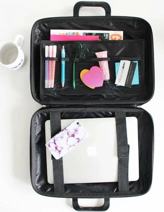De binnenzijde bevat pakbanden met klittenband om de laptop op zijn plaats te houden. Daarnaast biedt het harmonica opberg vak met drie compartimenten goede opbergmogelijkheden. EΓ©n van de drie vakken beschikt over een extra rits vak en is aan de buitenkant voorzien van een buidelnet met opbergvakjes voor bijvoorbeeld pennen, telefoon en kaartjes.