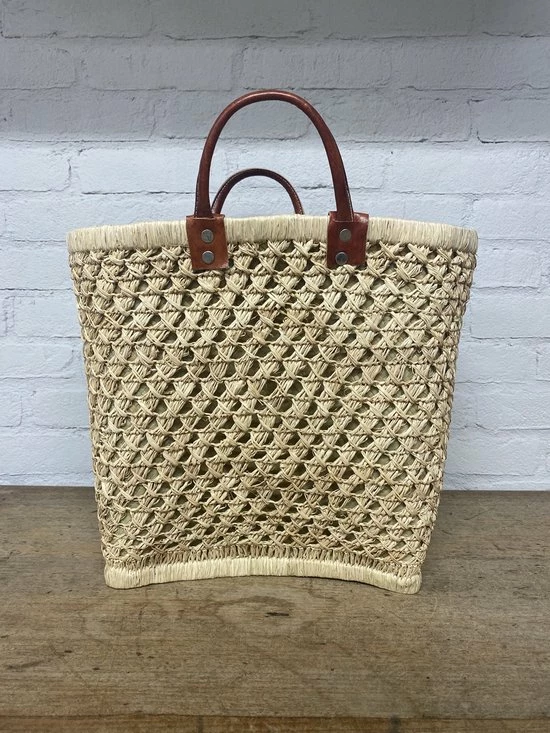 Gemaakt van naturel riet door speciaal vlechtwerk een mooi patroon heeft. Er overheen is een prachtig doorzichtig haakweerk van Raffia aangebracht.Tas heeft een platte bodem en blijft hierdoor stevig staan.