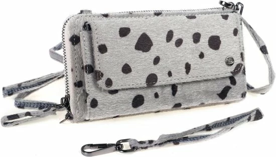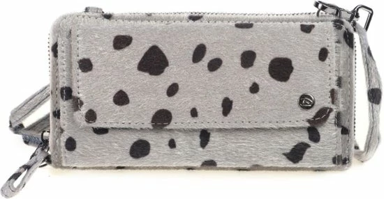Moderne, stijlvolle dames portemonnee Key West is weer een pareltje tussen de portemonnees. De portemonnee is uniek dankzij het vrolijke dalmatiΓ«r printje en het vachtje.De klassieke portemonnee wordt geleverd met een afneembare pols en schouderband. Key West is uitgevoerd in een hoogwaardig veganistisch leer en voorzien van een zacht vachtje. Deze portemonnee bevat een ruim voorvak geschikt voor verschillende I Phone of Samsung telefoons. Indeling binnenzijde: 3 grote vakken, een vakje met rits voor kleingeld en diverse insteekvakjes voor pasjes. De portemonnee wordt geleverd met hengsel en polsbandje. Deze ook-leuk portemonnee is een praktische en modieuze aanwinst voor uw accessoires!Details:Kleur: GrijsMateriaal: Veganistisch leerAfmeting: 20cm x 10cm x 5cmAfmetingen van het voorvak: 17cm x 8cm