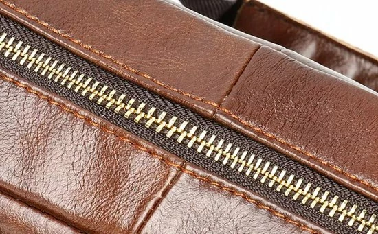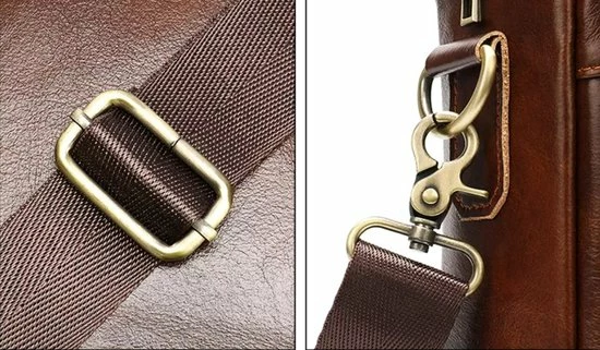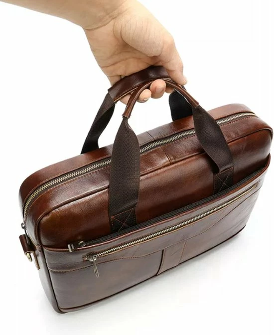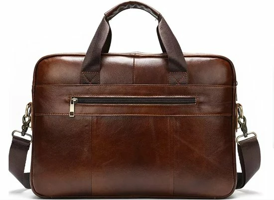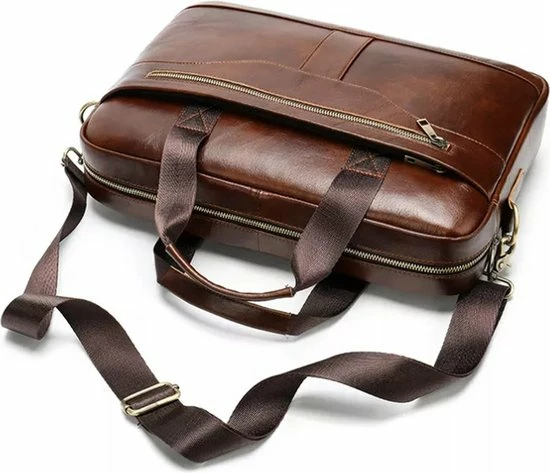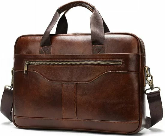 Stijlvolle waterbestendige laptoptas van mooi hoogwaardig leer. De tas bestaat uit twee compartimenten: het voorste hoofdcompartiment bevat twee kleine steekvakken, een groot steekvak waar A4 documenten in passen. Het achterste hoofdcompartiment heeft een steekvak voor een telefoon of andere accessoires en gewatteerd laptopvak dat geschikt is voor een 15 6 inch laptop. Op de voorzijde van de tas zit een groot vak met twee kleinere ritsvakken. De tas heeft een verstelbare en afneembare schouderband zodat u de tas ook als schoudertas kunt dragen.
