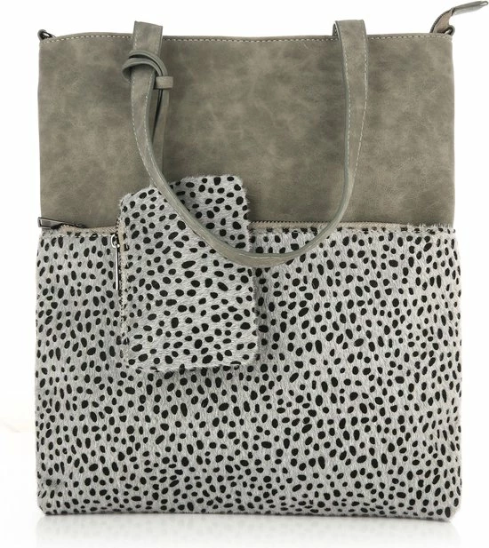 De onderkant en het kleine tasje zijn voorzien van een kort harig cheetahprint vachtje…Op de achterkant van de tas zit geen vachtje.