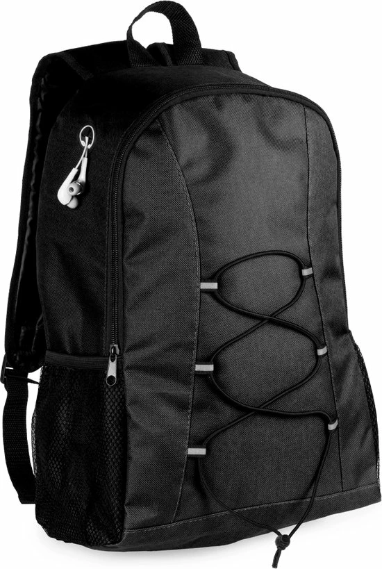 Neem jouw spullen gemakkelijk mee naar je werk of naar school in deze praktische zwarte rugzak! De rugzak is gemaakt van 100% polyester en heeft een uitgang voor je koptelefoon of oortjes. De tas heeft een ruim hoofdvak met ritssluiting waarin je bijvoorbeeld je agenda, etui en lunch gemakkelijk op kunt bergen. Ook heeft de tas twee mesh vakken aan de zijkant voor een flesje drinken of een paraplu. De schouderbanden zijn verstelbaar, waardoor je de rugzak perfect op maat kunt maken en met de lus kan de rugzak ergens opgehangen of gedragen worden. De perfecte tas om mee te nemen naar school of kantoor!