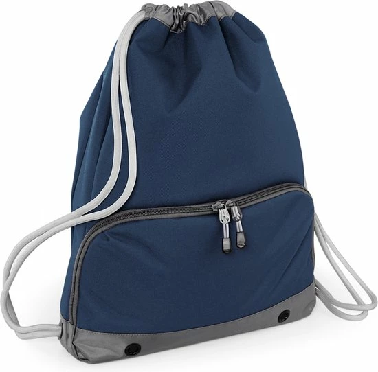 Sport gymtas donkerblauw met rijgkoord 49 x 35 cm van polyester met ruim hoofdvak, dikke stevige aanrijgkoordjes, metalen verluchtingsgaatjes, apart schoenenvak, waterdichte stof, flessenhouder. Inhoud: 18 liter.