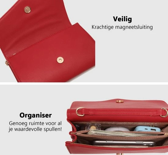 De tas doe je eenvoudig dicht met een magnetische sluiting in de klep en een aparte rits. De binnenzijde van de tas is voorzien van diverse insteekvakken voor je smartphone of portemonnee. Daarnaast heb je ook de beschikking over een ruim hoofdcompartiment voor accessoires zoals make-up.