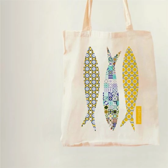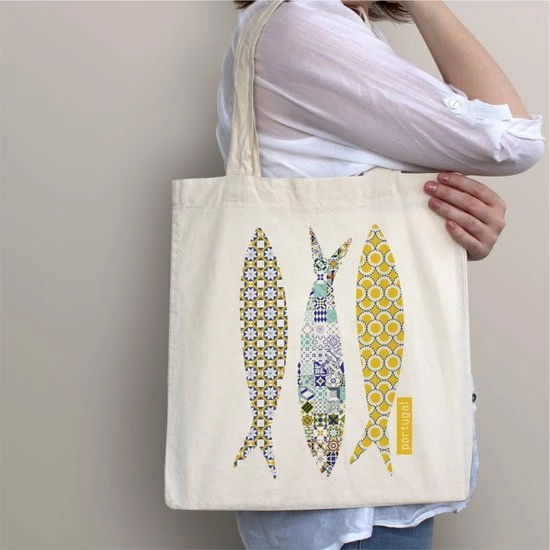 Neem jouw spullen mee in stijl, met deze katoenen draagtas. Mooie kwaliteit katoen, bedrukt met de typisch Portugese sardientjes in de kleur geel en kobalblauw.