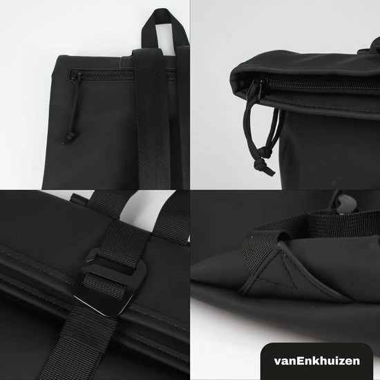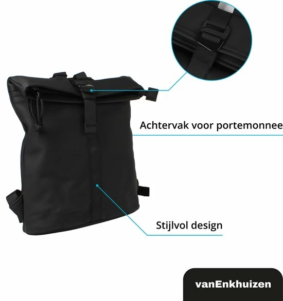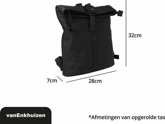 Neem je spullen overal mee naartoe in deze stijlvolle vanEnkhuizen Rolltop Rugzak voor dames en heren. Maak de rugtas groter en kleiner door de sluiting op of uit te rollen. In de 9 liter rugzak blijven al je spullen droog via het waterafstotende Tarpaulin. Houd je spullen warm of koud dankzij de thermo binnenzijde en gebruik de ritsvakken om kleine spullen weg te stoppen. Veilig de weg op in het donker is geen probleem door de reflectie strip op de rugzak. De gewatteerde schouderbanden zorgen voor ideaal draagcomfort, waardoor deze handige tas onmisbaar wordt.