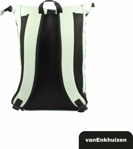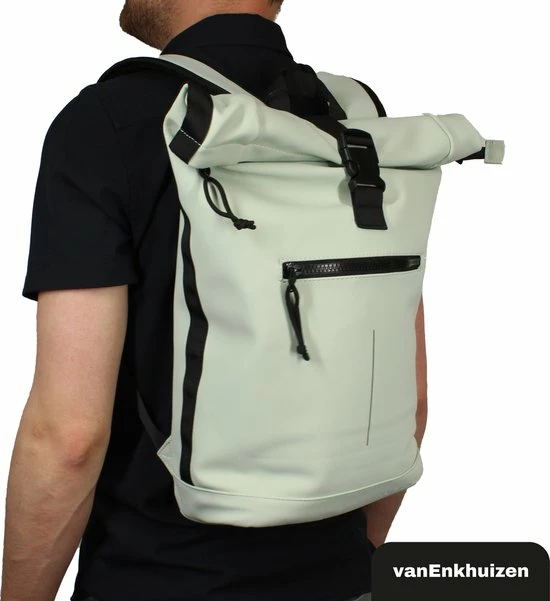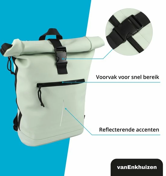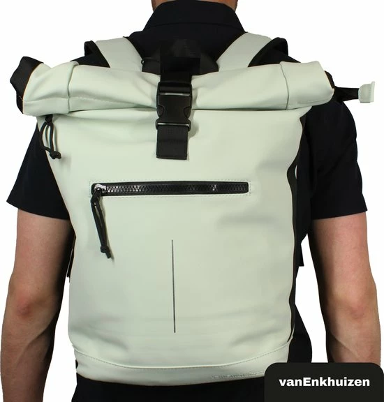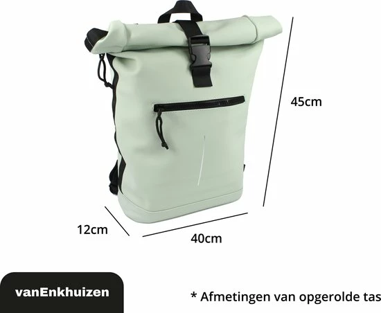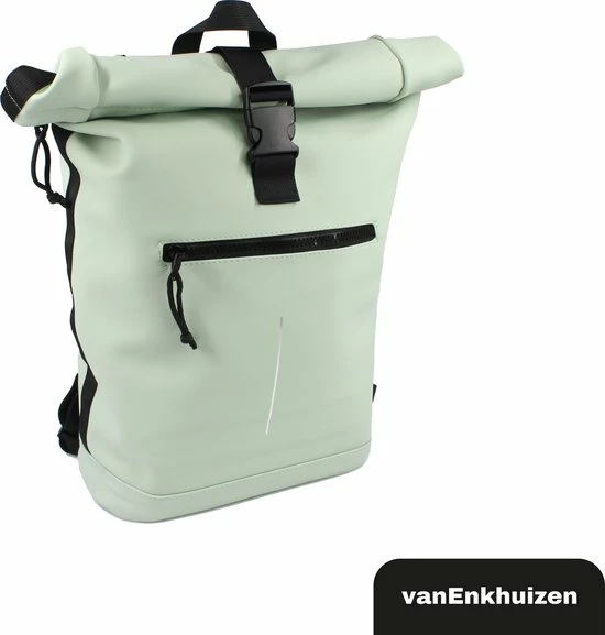 Neem je spullen overal mee naartoe in deze stijlvolle van Enkhuizen Rolltop Rugzak voor dames en heren. Maak de rugtas groter en kleiner door de sluiting op of uit te rollen. Het laptopvak biedt ruimte aan een 15,6 inch laptop, die droog blijft via het waterafstotende Tarpaulin. Houd je spullen warm of koud dankzij de thermo binnenzijde en gebruik de ritsvakken om kleine spullen weg te stoppen. Veilig de weg op in het donker is geen probleem door de reflectie strip op de rugzak. De gewatteerde schouderbanden zorgen voor ideaal draagcomfort, waardoor deze handige tas onmisbaar wordt.